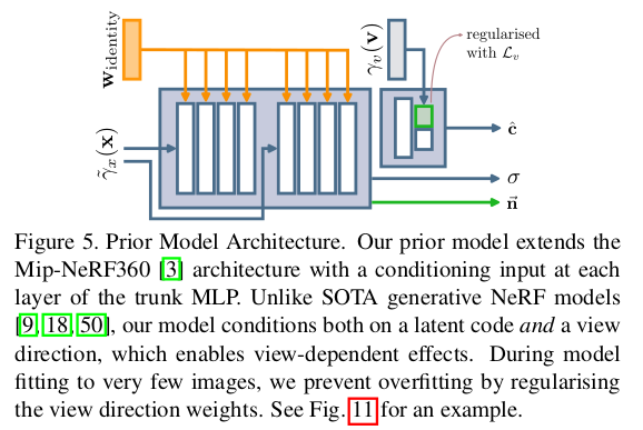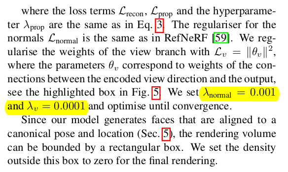 ![]() MipNerf 360을 기본 구조로 차용. loss도 차용 다만 unbound space가 아니므로 공간을 압축하는 내용은 뺌. identity를 표현하는 latent vector 하나가 모든 단계 feature에 concat으로 추가되는 형태로 condition 추가. 해상도는 512 768 세로가 길다. |