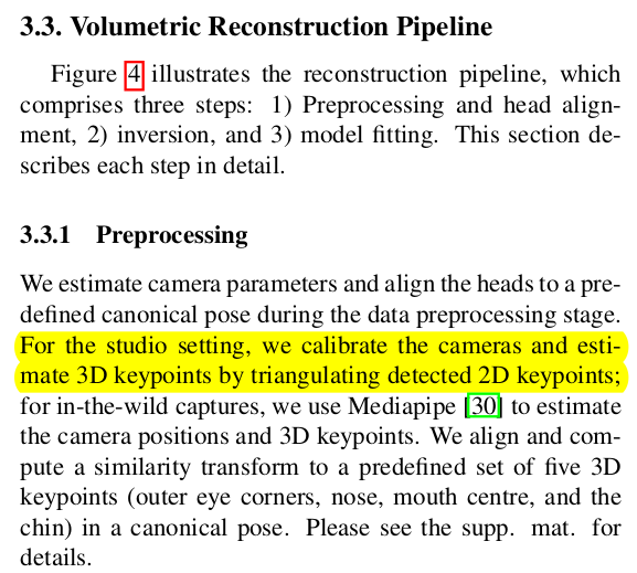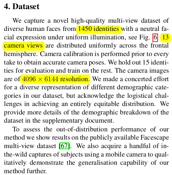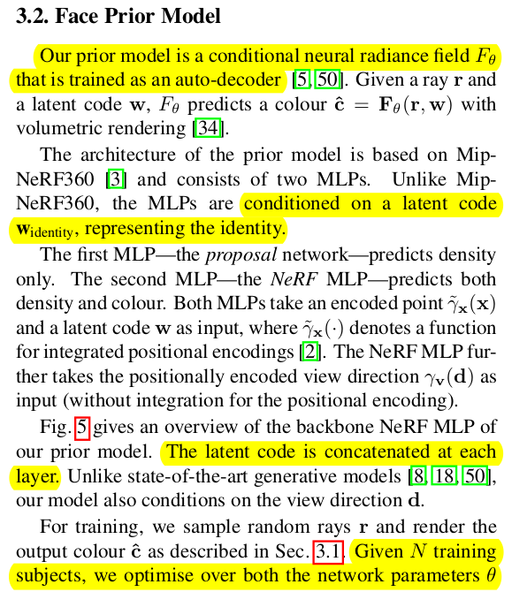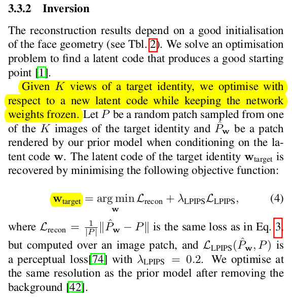 구체적으로 보면 3 단계임 1) low resolution + identity conditioned NeRF를 1450명 갖고 사전학습함. 2) prior model freeze해두고, identity condition을 inversion으로 찾아냄 3) identity condition 고정한 채, prior model finetuning. |