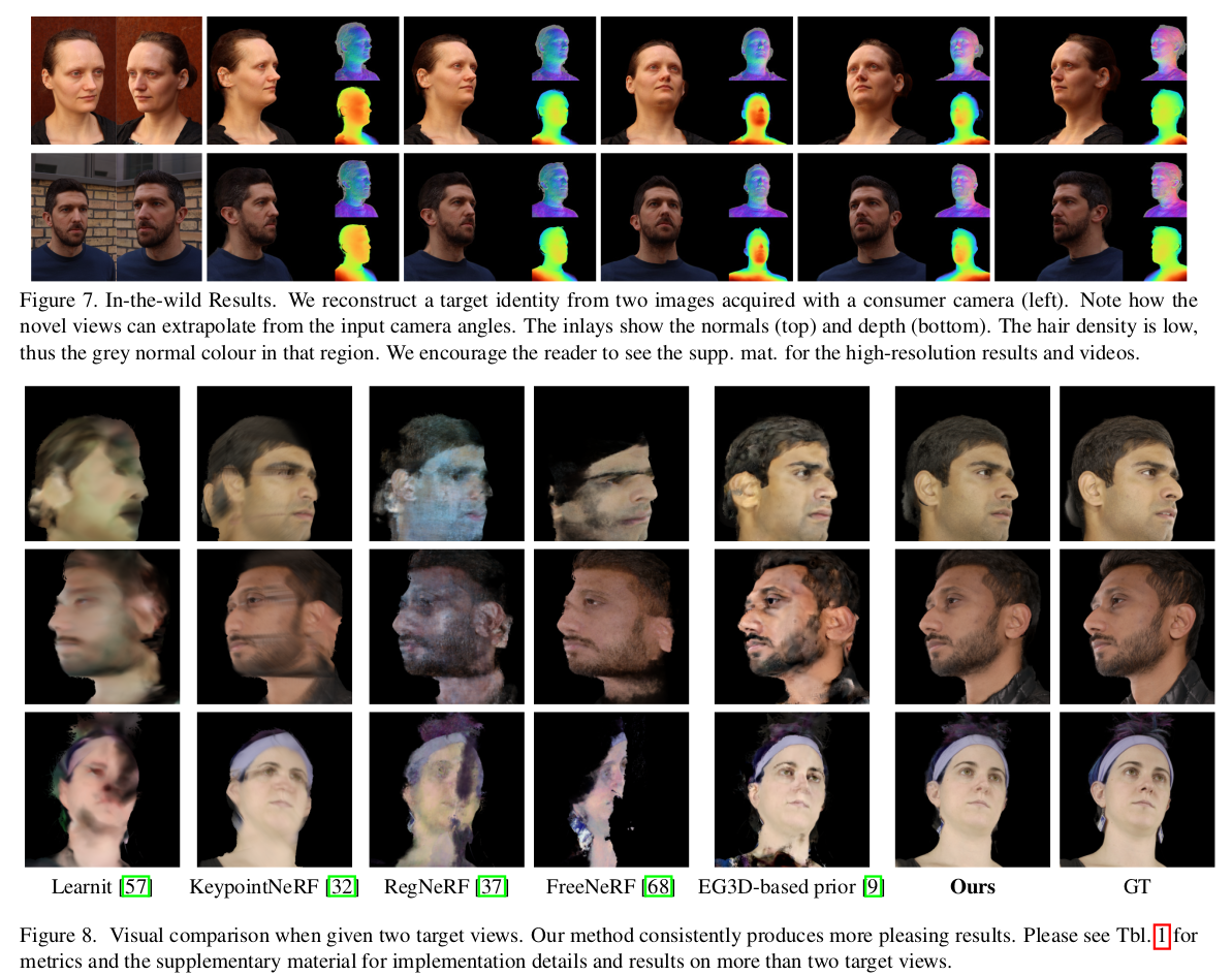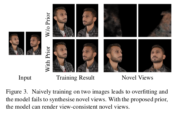 그냥 무식하게 2~3장으로 학습하면 당연히 overfitting 돼서 novel view synthesis가 안된다. 왼쪽 그림처럼 하지만 위 그림처럼 엄청 많은 사람 이미지로 사전 학습해둔 (identity conditioned) 모델이 있다면 이걸 초기값으로 써서 돌파할 수 있다고 보여준다. |