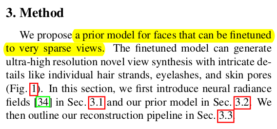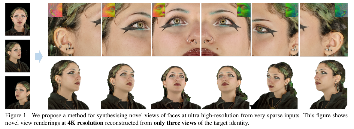 제목 그대로 2~3장 갖고 4K 해상도 NeRF 학습시키는 방법. 핵심 아이디어는 사람 1450 명으로 사전 학습시킨 prior model, NeRF를 초기값으로 쓰는 것. 초기값이 엄청 정확하게 잡아주기 때문에 4K 이미지 몇장으로 튜닝만 하면 큰 노력없이 위와 같은 결과를 얻을 수 있다고 보여줬다.