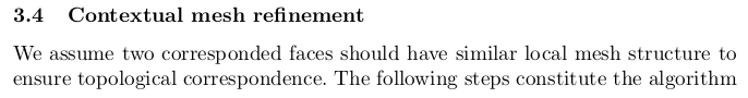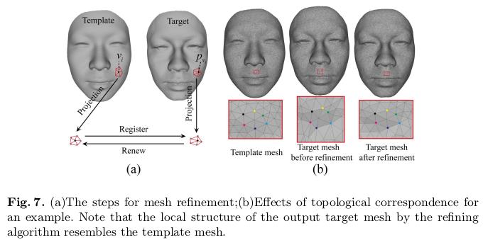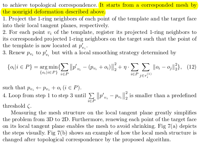 이렇게 마무리 하는 것이 아니라 마지막은 topology까지 유사하도록 최적화를 한 번 더 해준다. template vertex 하나 1-ring neighbor를 뽑고 corresponding vertex에서도 1-ring neighbor를 뽑는다. 그리고 두 set을 tangent plane으로 평평하게 proejction. target plane을 그대로 template plane에 덮어쓰기 하고 수식(12)로 최적화 한 번 더. topology가 점점 target을 닮아감. |