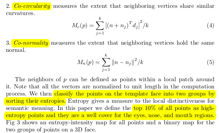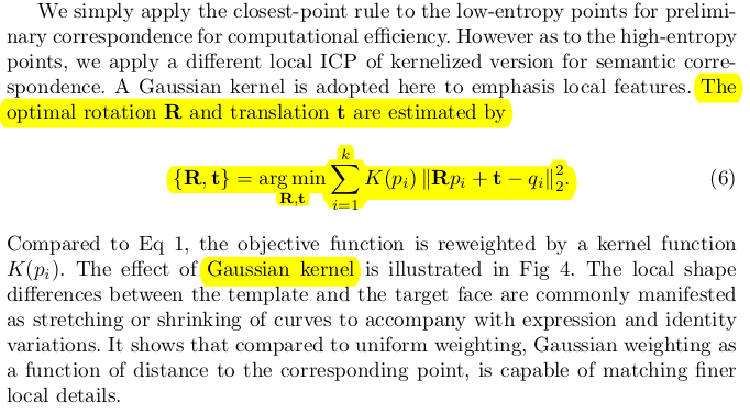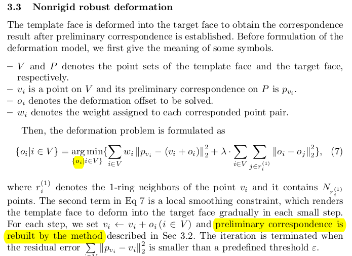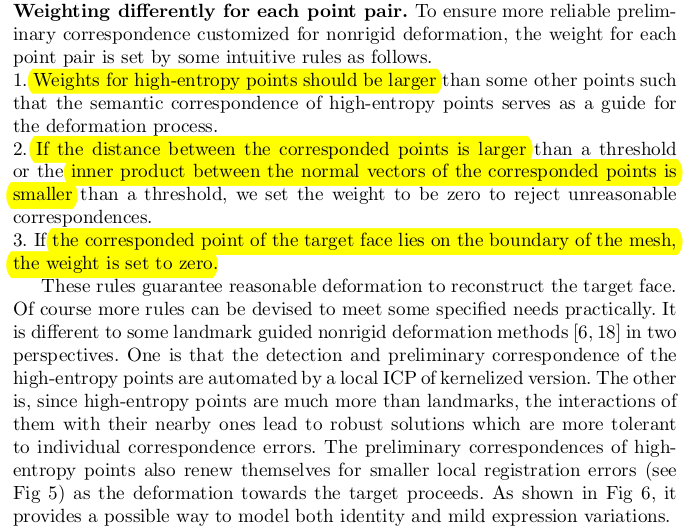 위 전체 과정을 거칠 때 vertex 별로 weight가 조금씩 다름 1) high score이면 high weight 2) correspondence끼리 거리가 너무 멀면 오히려 0으로 만들어서 무시하도록 3) 얼굴 경계 vertex는 0으로. |