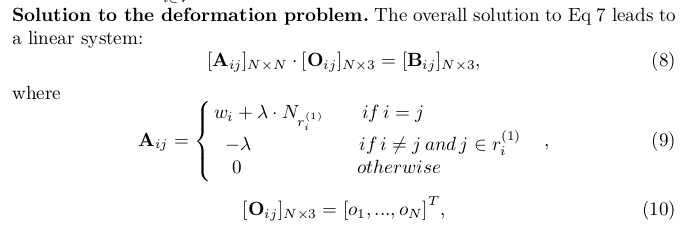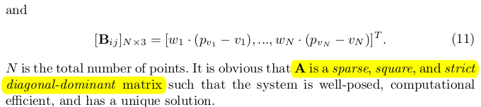 3단계인 nonrigid robust deformation 수식(7)은 최적화로 푸는게 아니다. closed form으로 풀리기 때문에 그냥 계산해내면 된다. 속도가 빠름~ 당연히 해는 현재 correspondence가 그대로 옳은 correspondence일테니까 diagonal value가 크게 나오는 형태여야 한다. |