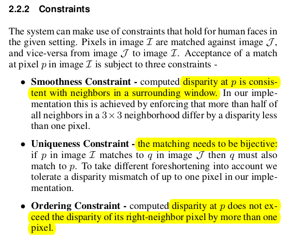 disparity 매칭할 때 재매칭 대상 선정을 디테일하게 더 보면 smoothness 말고 2가지 더 있음 1) smoothness 주변 neighbor disparities와 크게 다르지 않을 것. 1 pixel 미만으로 차이나야 함. 2) uniqueeness : left to right, right to left matching 시 똑같아야 함 결과가. 3) ordering disparity는 절대 왼쪽 오른쪽 이미지가 뒤집히는 방향으로 나올순 없다. 왼쪽 이미지보다 오른쪽 이미지가 왼쪽에 있다고 나오면 당연히 잘못된 것. 위 1~3)에 해당하면 재매칭 시도. |