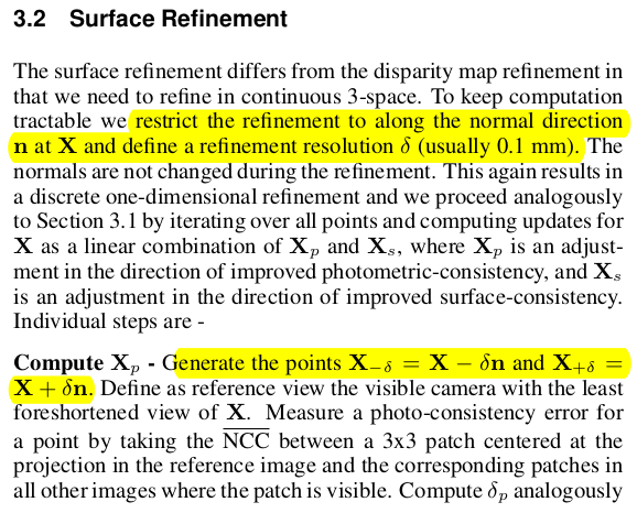 이렇게만 해도 충분해 보이지만, 최최종 업데이트가 한 번 더 있다. 이제는 각 disparity map을 업데이트하는게 아니라 poisson recon한 뒤에 normal을 갖고 업데이트한다. 현 3d point를 normal 방향으로 +- 0.1mm 씩 움직이면서 보정해보는 것이다. (0.1mm .....) normal은 고정 disparity 업데이트할 때랑 동일하게 NCC가 더 증가하고 smoothness가 더 증하도록 업데이트하는 것. 방식 동일. |