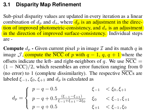 우선 좌우 픽셀을 본다. (recitfication되어 있으므로 좌우만 보면 됨) 좌우 픽셀의 disparity로 좌우 NCC를 계산해보았을 때 현 위치 NCC보다 클 때, 중간일 때 작을 때에 따라 업데이트한다. 만약 좌픽셀의 NCC가 제일 작다. disparity 오른쪽으로 이동 현 픽셀의 NCC가 제일 작다. 좌우 NCC로 weighted interpolation한 위치로 disparity 이동 우픽셀의 NCC가 제일 작다. disparity 왼쪽으로 이동. |
