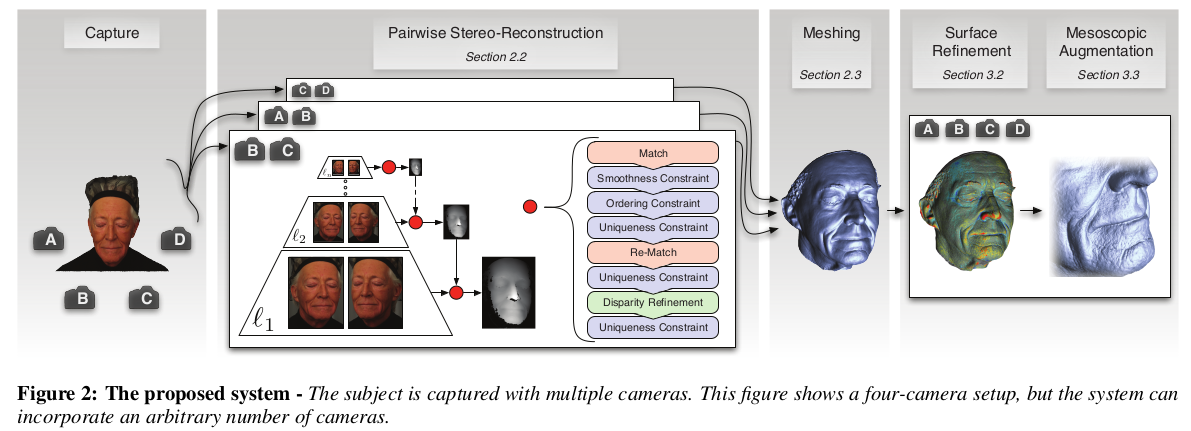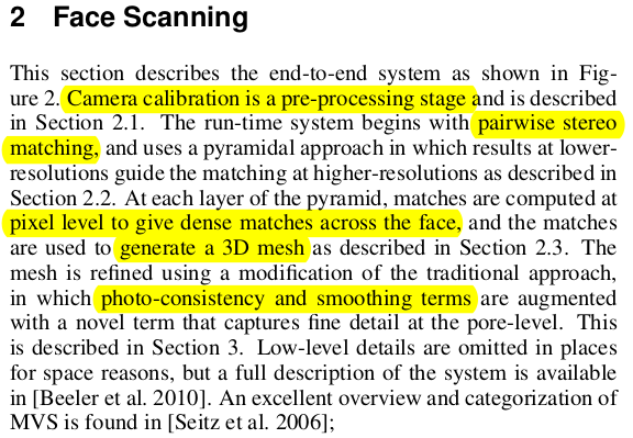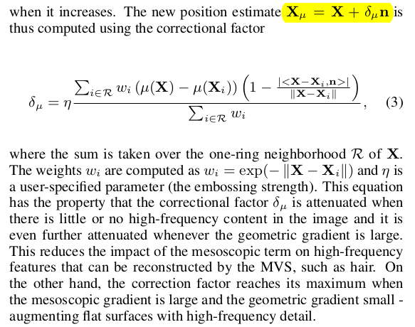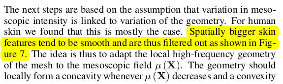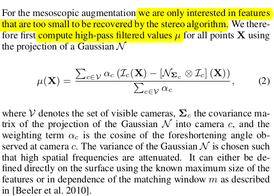 여기서 mesoscopic 이라는 단어는 그냥 모공이 잘 보일 정도의 해상도 라는 뜻. 최최종 refinement의 목적은 앞선 stereo matching에 0.1mm 수준의 정말 정말 디테일한 보정을 시도하는 것 정도임. 앞선 NCC + smoothness 말고 하나 더 추가! ![]() 마이너한 보정은 모공이나 주름같은 수준일게 분명할테니, 보정의 시작은 이미지에 high pass filter를 씌우는 것으로 시작한다. mu(X) = high pass filter 씌운 이미지랑 안씌운 이미지랑 차이를 대충 의미하는 값. |