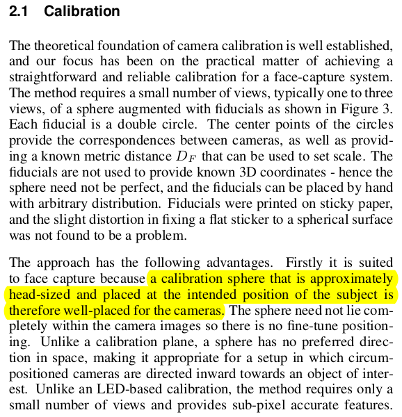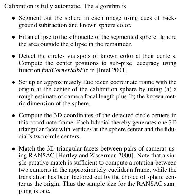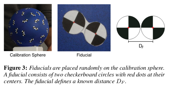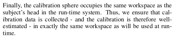 ![]() ![]() 캘리브레이션은 실제 사람 머리 크기만한 sphere를 머리가 있을법한 위치에 두고 맞춤. sphere 표면에 왼쪽 그림과 같이 생긴 패턴을 불규칙하게 붙여서 triangulation 정확도로 맞췄다. 오른쪽 알고리즘은 어떻게든 정확하려고 Ransac까지 돌려가면서 triangulation 정확도 올린 방법. |