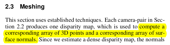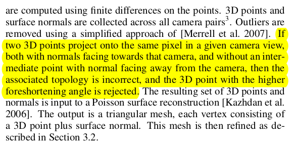 disparity를 구했다는 말은 각 스테레오 세팅으로부터 backprojection 해서 Point cloud를 일단 만들겠다는 소리다. point cloud to mesh는 어떻게 했냐? 1) 각 시점 각 3d point마다 normal 계산 (depth map + camera pose가 있으니 가능) 2) 모든 시점 back projection 3) 한 시점으로 다시 reprojection 한 픽셀에 2개 이상 3d point가 reprojection 되면, 해당 point 중 foreshortening angle이 큰 녀석을 제외 -> 이게 무슨 뜻인지 잘 이해가 안가는데, 카메라 시점에서 보았을 때 카메라 ray랑 point normal이 90도에 가까울 수록 삭제했다는 뜻인듯 -> 왜냐면 카메라 ray랑 평행할수록 surface가 카메라에 정면으로 잘보인 거니까 disparity 계산이 쉬웠을 것이고 신뢰도가 높았을 것. -> 따라서 저 말은 point normal이 카메라 안바라보고 있고 다른데 쳐다보고 있으면 지웠다는 말인듯. |