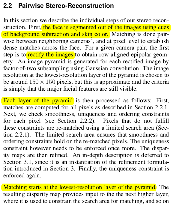 각 level에서 disparity 매칭은 기존 stereo와 똑같음. window size 3x3으로 고정하고 NCC를 매칭하는 방식 (여기서 3x3이 너무 작다고 할 수 있는데, 3x3 같이 작은 수준에서 매칭하기 때문에 디테일 업데이트에 유리하다. 조금만 변해도 값이 크게 변하니까) 2번 매칭 시도를 하는데, 처음에는 그냥 매칭을 한다. -> 그다음 첫 매칭 결과를 smoothness 평가하고, smoothness가 튀는 결과는 초기화한 뒤, 이웃 disparity를 기준으로 다시 매칭함. |