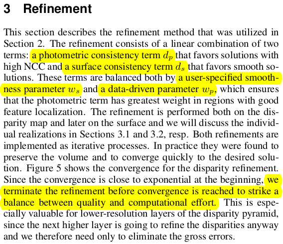 disparity 추정을 극한으로 끌어올리는 방법은 위 coarse-to-fine으로 NCC 매칭하는 것으로 끝나지 않았다. 각 disparity map마다 photometric consistency로부터 오는 delta d, surface consistency로부터 오는 delta d 총 2개의 residual을 만들어 두고 업데이트를 한 번 더했다. 대략 어떤 느낌이냐면, 현 disparity NCC로 현 pixel을 보고 계산한 것인데, 이제는 양옆 disparity로 미루어보아 어떻게 조금 더 움직이면 주변 NCC까지 고려했을 때 더 정확할 지 찾아보는 것. |