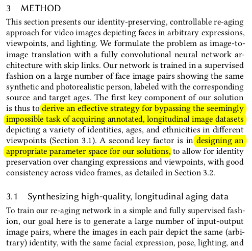 ![]() aging network의 문제는 결국 데이터다. 나이가 들어가는 같은 사람 데이터를 대규모로 확보할 방법은 존재하지 않기 때문. 이 문제는 그냥 기존 SAM 처럼 나름 잘 생성하는 aging network를 가져와서 찍어내는 방식으로 해결했다. SAM을 그냥 믿는 것 SAM이 age control이 되는 styleGAN이니까 믿고 대량으로만 찍어냈다. |
