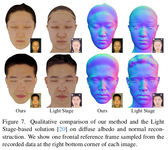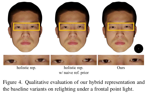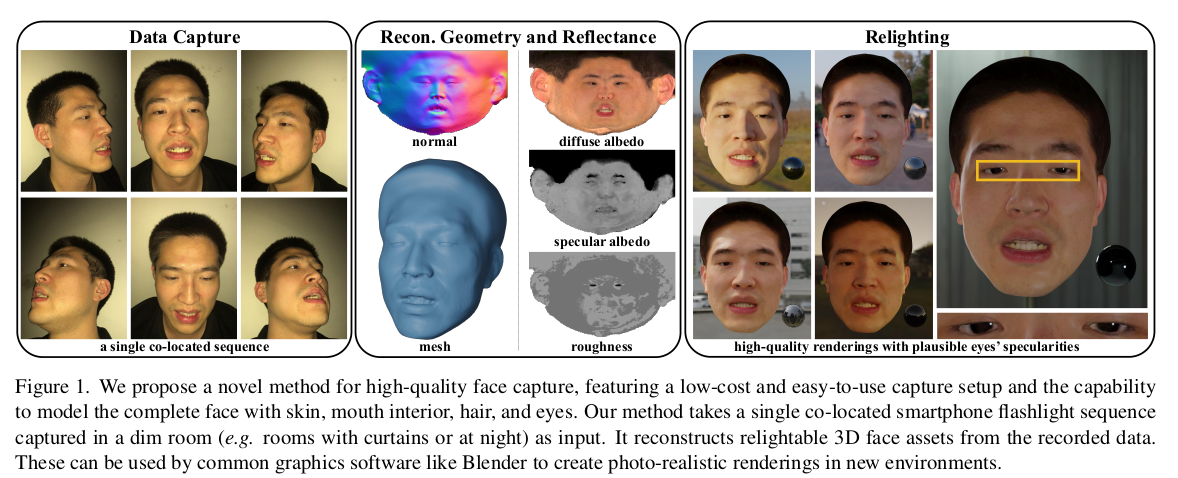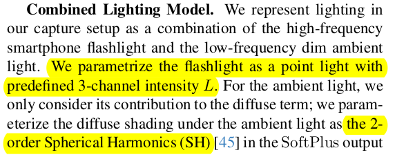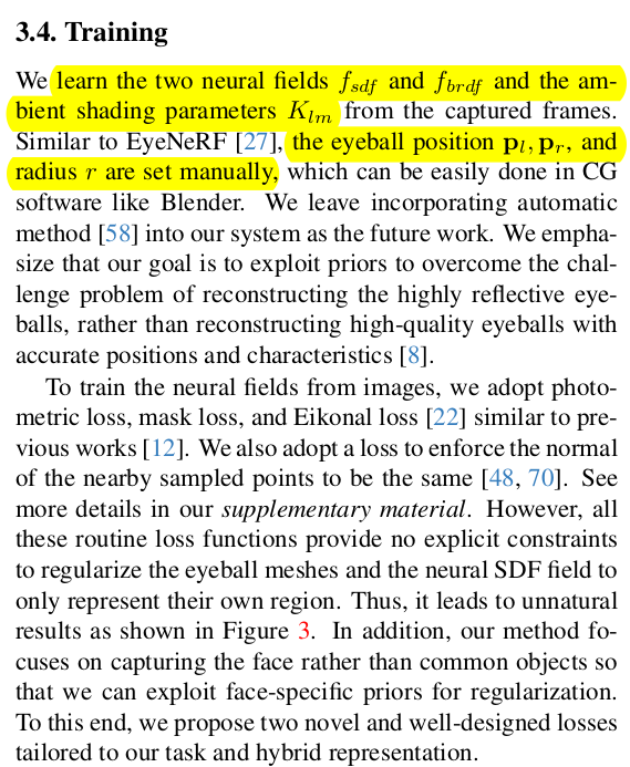 얼굴을 복원할 때, 눈알과 나머지로 나눈다. 그 이유는 BRDF를 추정하긴 하지만 눈알은 specularity가 피부와 다르므로 통째로 학습하면 성능이 나쁘기 때문. 따라서 눈은 sphere mesh + fixed specularity로 미리 설정해두고 눈 제외한 피부를 주 타겟으로 선정했다. --------------- 눈은 사전에 사람이 위치와 크기, specularity를 지정해준다. 손으로 어떻게 했느냐? 라고 생각할 수 있는데 내 생각엔 agisoft 결과 mesh 보고 눈알을 대충 갖다 붙인 것 같다. blender같은 툴 가지고. |