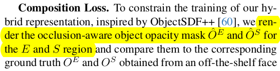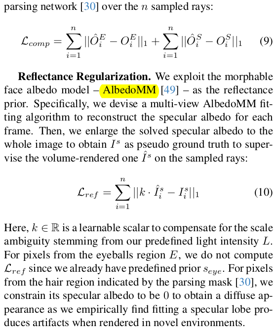 이렇게 하면 눈알을 따로 처리했음에도 살짝 눈알 부분 geometry가 조금 안 맞음. 그래서 OjbectSDF++에서 나오는대로 occlusion 반영한 mask rendering 하나 만들고 segmentation network 통해서 2D image 상에서 눈알 mask 찾아가지고 서로 같도록 추가 regularization을 했다. 눈알과 피부가 적절하게 서로 위치하도록 조정되는 효과 ---------------------- 마지막으로 아까 조명 L 값을 사전 지정했기 때문에 실제 조명 값과 차이가 분명히 있다. scale ambiguity가 있으므로, learanable scale factor, k 를 둬서 loss에서 ambiguity를 알아서 풀도록 설계했다. |