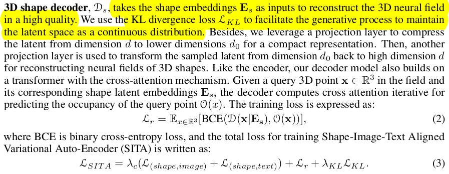 이것으로 끝나면 3d shape latent는 그냥 image/text latent를 흉내내는 하위 latent가 되어버리므로, 독자적으로 3D에 대한 정보를 더 들고 있도록 보강해줘야 됨. (image/text prior ++가 되도록) 그 방식을 3d shape latent를 갖고 SDF를 예측하는 decoder를 추가하는 것. 3d shape latent + xyz query로부터 mesh를 직접적으로 결정하는 SDF를 예측하도록 학습하면서 3D shape latent가 image/text latent를 닮아가되 본질인 3D 정보 함축도 할 수 있도록 유도함. |