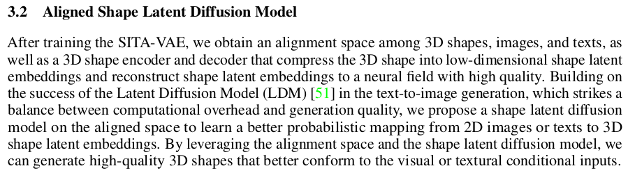 image/text 에서 mesh로 바로 가는 것을 지적하며 중간 3D shape latent를 만드는 방식을 소개 VAE로 3D shape latent space를 만든 뒤, Diffusion으로 3D shape latent sampling -> mesh 순서다. diffusion 시 image/text conditioned 3d shape latent generation이라서 전체 프레임워크는 image to mesh, text to mesh 그대로 유지하게 된다. |