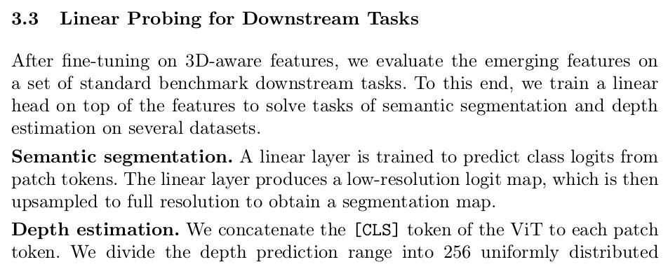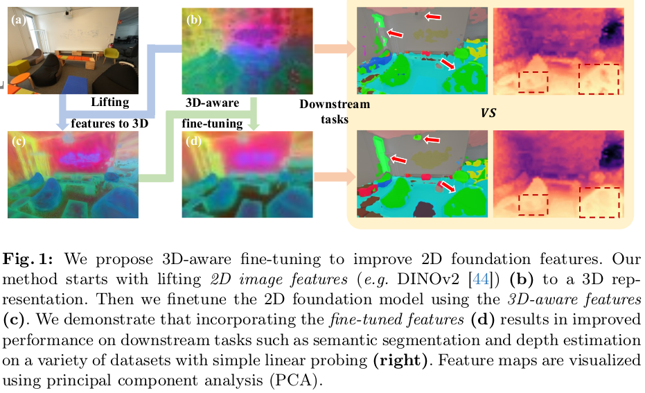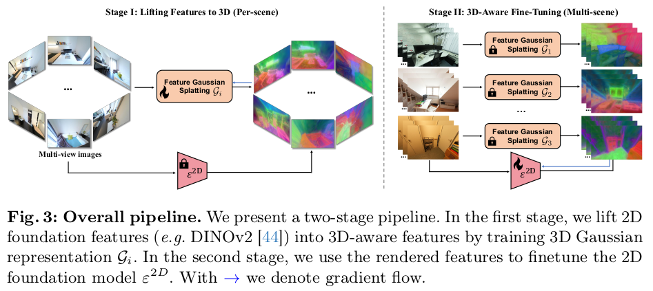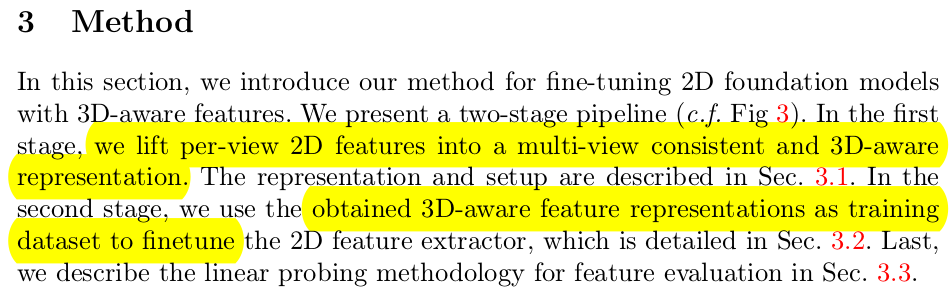 이 논문은 DiNOv2를 예시로 썼지만 foundation model에서 나온 2D feature를 3D-aware형태로 튜닝하는 방법론을 설명한다. 2D 이미지를 어마어마하게 먹어서 어느 정도 3D-aware라고 "할 수도" 있겠지만 명시적으로 3D를 보고 배운 것이 아니기 때문에 아쉬운 점이 있다.