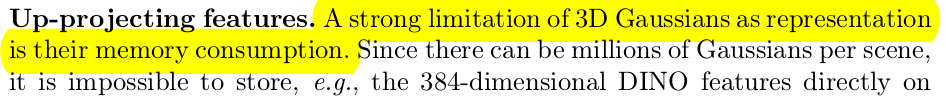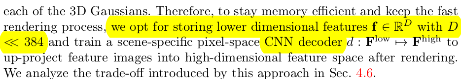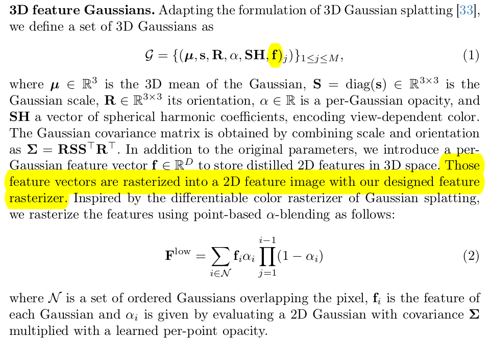 D=64 dimension의 3d feature가 할당되고 learanable이어서 2d feature guidance를 통해 수렴함. 이를 다시 2d 로 내리는 것은 기존 3DGS alph blending을 따름. |