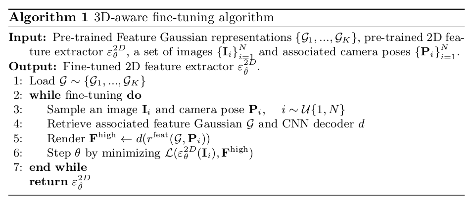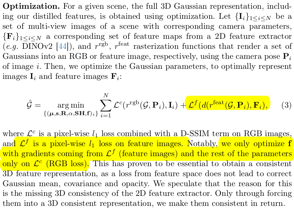 3D feature gaussian을 2D feature + camera pose로 학습시킨 뒤, 이를 이용해 다시 각 view의 2D feature를 튜닝하는 식이다. 크게 보면 multiview-feature aggregation한 뒤, 다시 each singlview를 튜닝하는 self-supervised에 가깝다.