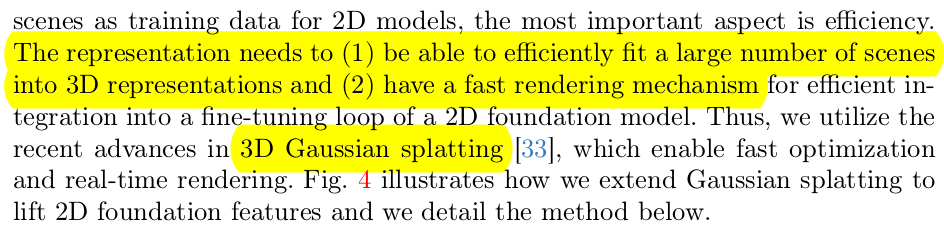 3D representation 이 MLP도 있고, tri-plane도 있고, gaussian도 있고 다양한데 이런 방식이 시간 소모와 메모리 소모가 큰 방식이다 보니 최소화 하기 위해 3D GS를 선택함 기존 3DGS 파이프라인에 feature rasterizer를 직접 구현해서 끼워넣는 식으로 구현함 |