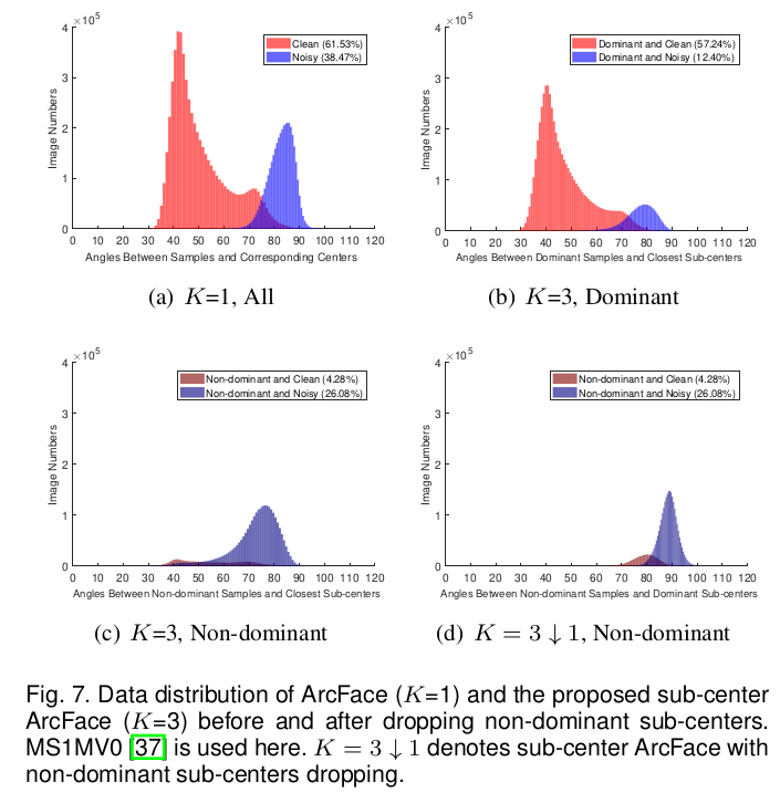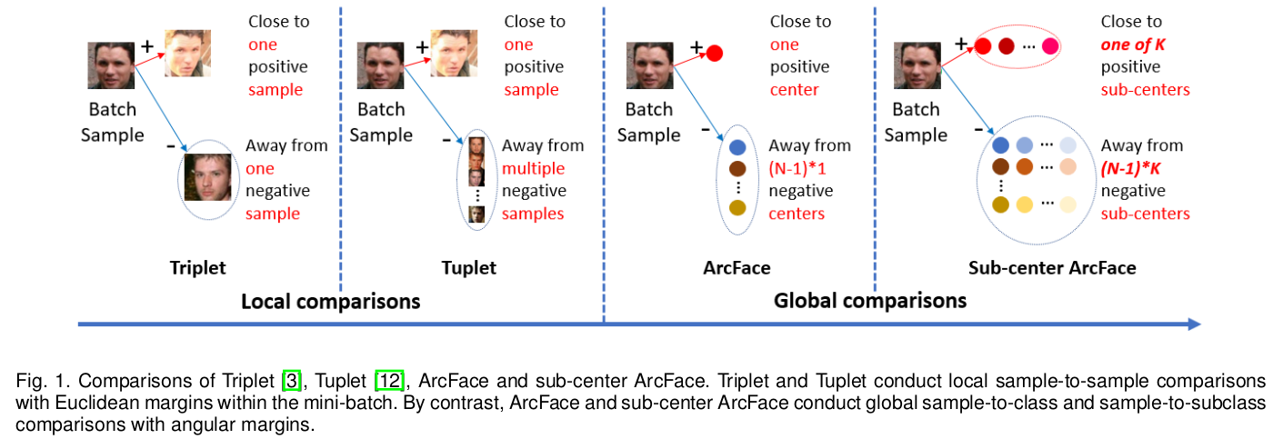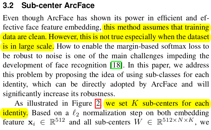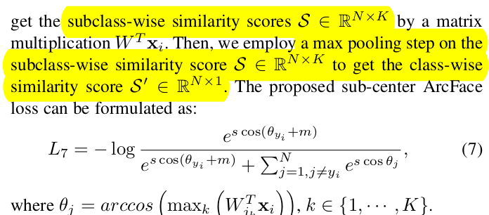 더 성능 향상에 기여하는 것은, N개의 learnable embedding을 NxK로 확장해두는 것. 같은 class 라도 K개 가능성을 열어두는 것. (얼굴 인식에서는 K개 중 일부가 가려진 얼굴, 선글라스 등을 담당하도록 수렴함. 나머지 가 더 집중하면서 성능이 향상됨) K dimension 방향으로 max pool만 추가해주면 됨. |