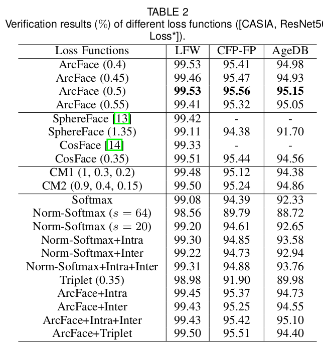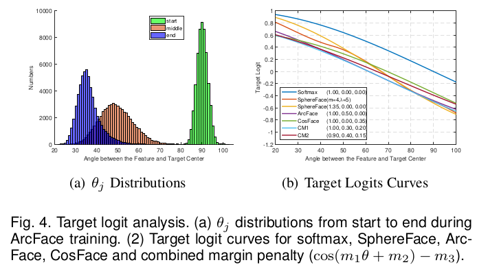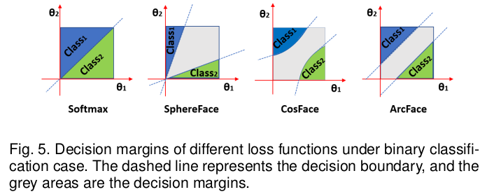 log-softmax와 비슷한데, 단순히 값을 input으로 넣는 것이 아니라, learnable embedding N개를 만들어두고, 가까운 embedding과의 "각도"의 cosine 값을 사용한다. 직관적으로 보면 feature 간의 각도를 벌리도록 설계하는 것. 여기다 마진을 조금 더 더해주면 분별력이 많이 향상된다는 것이 핵심
