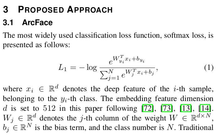 classification을 푼다고 하면 softmax가 거의 정석이다. 하지만 이 방식은 N이 늘어날수록 효율이 감소하고, feature 혹은 embedding 간의 관계는 명시적으로 컨트롤하지 않기 때문에 비슷한 샘플의 feature가 가깝다고 보장할 수가 없다. ------------ 이 문제를 풀기 위해서 각도 개념을 제안한다. learnable embedding N개 (필요한 차원만큼 미리 생성) 과 feature 간의 각도 값을 softmax의 value 대신 사용하는 것 (수식2를 보는 것이 더 빠르다.) numerical 안정성을 위해서 scale factor s가 추가됐고, 각도 차이를 벌릴 때 margin을 두고 더 강하게 벌릴 수 있도록 각도 값에 margin을 더해주는 것이 최종 형태가 되겠다. 여기서 +0.5로 고정되어 있는 이유는 arccos으로 각도값을 구하는데 arccos는 0~pi 이기 때문이다. |