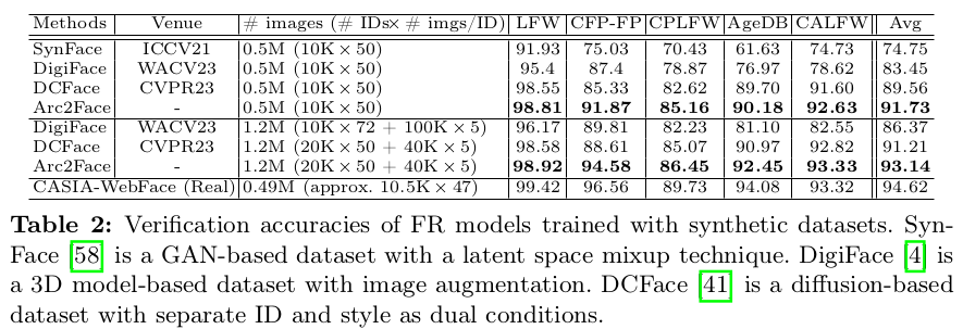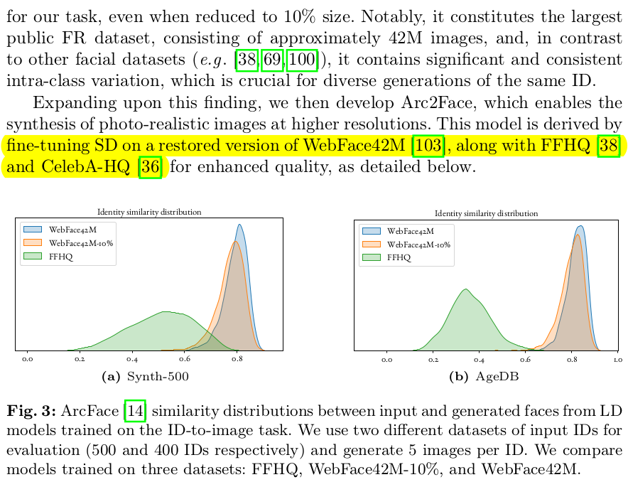 주목해야 할 점은 오히려 분석에 있다. SD를 뒷받침할 만한 large scale arcface embedding이 필요한데 기존 데이터셋 중 나름 크다고 하는 FFHQ 70k 이미지를 사용해도 부족하다. 1명 당 1장의 이미지가 있기 때문에 id 분별력이 떨어진다는 것. 따라서 Webface42M 처럼 1명당 이미지가 여러개고 스케일도 훨씬 큰 데이터가 절대적으로 존재해야 학습이 가능하다고 한다. "webface42m 10%"가 100%에 준하는 결과를 보이는 것을 보면 1명 당 여러장 >>> 이미지 개수 인 것 같다. |