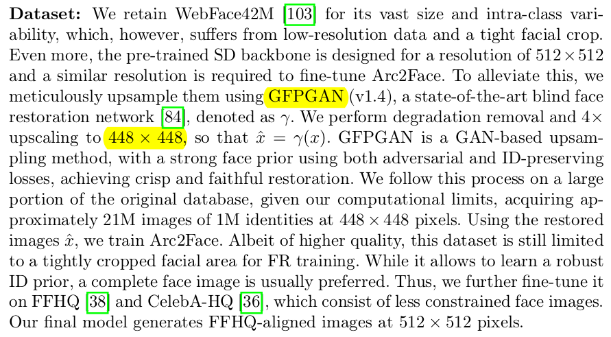 webface42M을 쓰는게 좋은데, 해상도가 100 단위로 너무 작으므로 GFPGAN(텐센트에서 만든거라 성능이 괜찮은 SR)을 붙여서 4배씩 불려서 사용했다고 한다. |