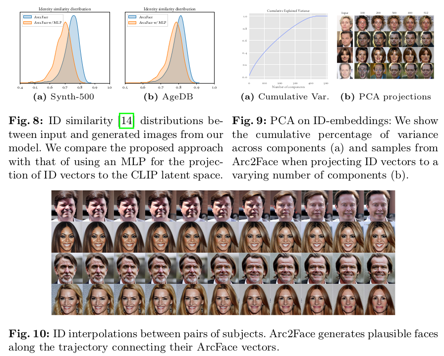 | CLIP 자체에 ID embedding을 입력으로 넣어주는 방식이 MLP보다 약간이지만 성능이 더 뛰어남. PCA로 ID embedding을 보면 N을 작게 쓰면 터무니 없음( ID embedding이 진짜 복잡하다는 말. ->arcface파워가 굉장히 중요) |