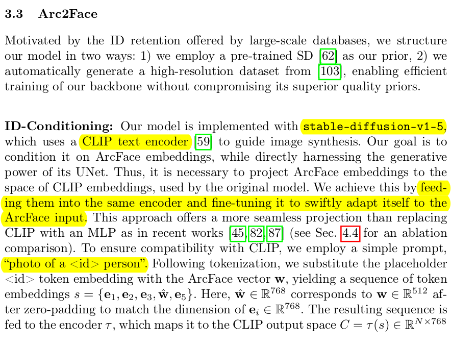 SD1.5에 CLIP을 learnable로 열어두고 CLIP에 입력(text)에 ID embedding을 끼워넣어 재학습. -> 의도는 CLIP features space와 ID embedding space가 자연스럽게 merging되도록 설계한 것. -> 단순 MLP를 썼을 때보다 성능이 좋았다고 함. |