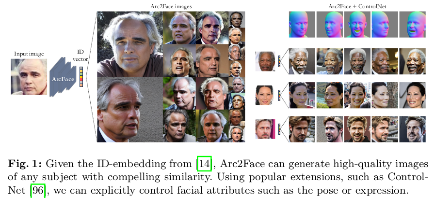arcface 논문을 낸 그룹에서 후속 연구 느낌으로 낸 논문. arcface가 Face ID embedding을 훌륭하게 해주는 네트워크인 점을 이용해서 arcface embedding을 condition으로 사용하는 face 전용 diffusion model을 만들었다.
