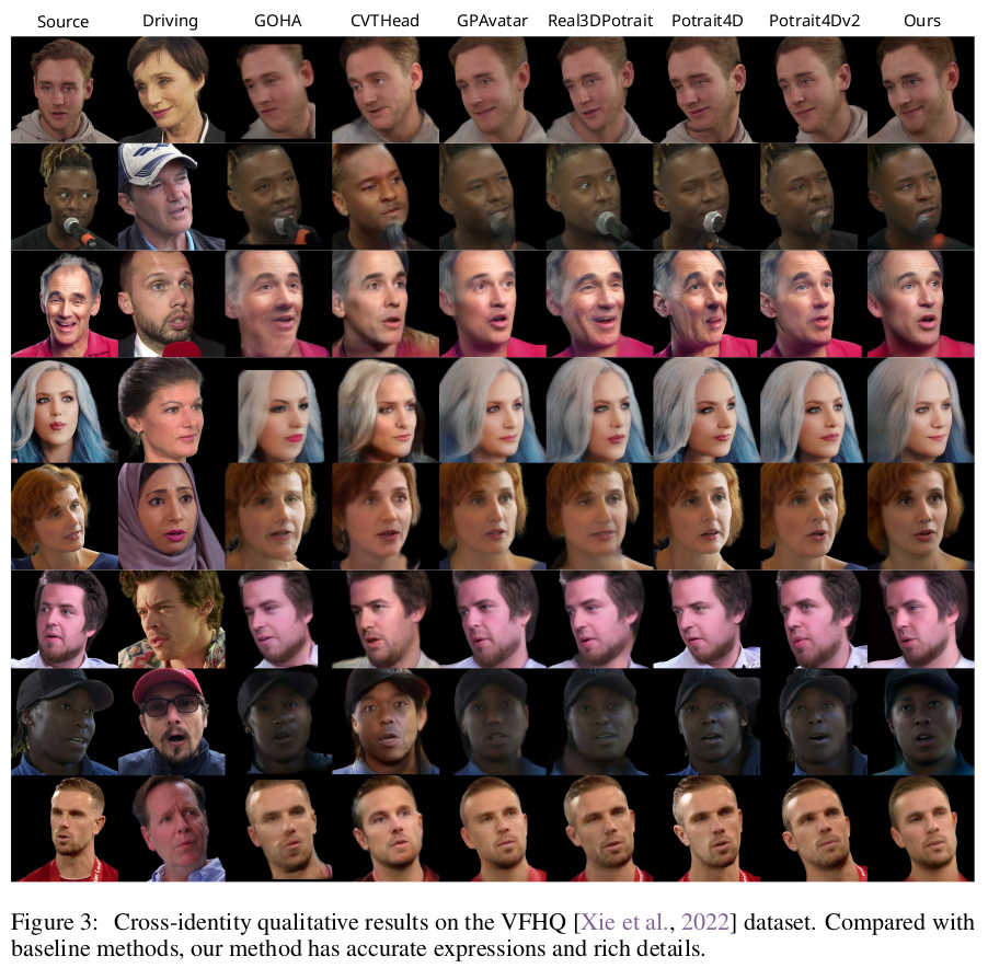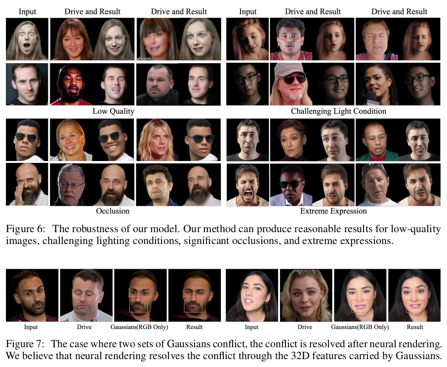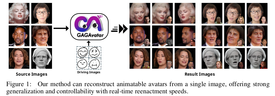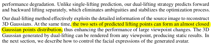 단일 이미지로 부터 Gaussian head를 만드는 논문. 3DMM prior를 사용하기 때문에 driving image에서 뽑아낸 3DMM을 사용할 경우, animatable해진다. 학습은 video 데이터셋을 이용해서 자기 자신의 3DMM prior를 사용하지만 inference 시에는 다른 사람 이미지의 3DMM prior를 사용하는 방식이다.