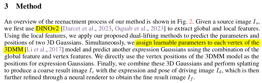 DinoV2를 기본값으로 사용 3DMM은 이미지로부터 뽑아내두고 사용 3DMM vertex마다 learnable feature를 부여해둠 (semantic 구분용) |