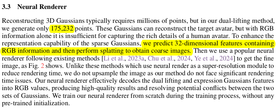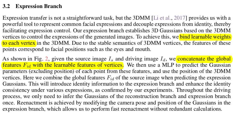 source, driving image에서 각각 3DMM을 뽑은 뒤, driving 3DMM에서 각 vertex feature + dinov2 global feature를 concat해서 최종 vertex feature를 만든다. 이 때 초기 vertex feature는 3DMM 모델 자체에 할당된 것이라 학습 내내 공유된다. 3DMM vertex의 semantic 정보를 들고 있도록 수렴함. 그 다음 driviing vertex feature + source vertex position query를 받아 MLP 통과 후 Gaussian param 예측. 결과적으로 reconstruction branch에서 나온 GS expression branch에서 나온 GS 2개의 집합이 존재하는 것. |
