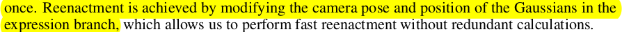 expression branch에서 나온 3DMM과 reconstruction branch에서 나온 GS를 knn nearest로 묶어서 binding한 뒤, 3DMM을 바꿔치기 해서 animation을 하는 것 같다. 이것도 자세히 설명 안하고 알아서 했음 ㅋ 이런 뉘앙스라 조금.... |
