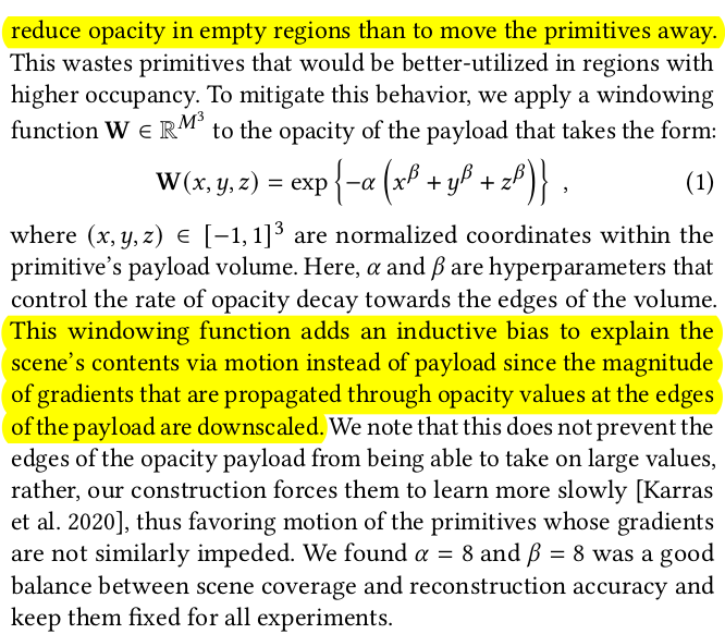 그리고 각 vp가 전체 volume 내에 동일한 값을 갖도록 설정한다면 vp가 조금만 넘어가서 특정 ray에서 쓸모 없다고 판정되면, 다른 ray에서는 쓸모가 있어도 opacity가 낮아질 가능성이 있음. 즉 edge에서 어떤 ray에 걸리냐 안걸리냐 때문에 gradient가 불안정해짐. 따라서 vp 내 voxel마다 가중치 필터를 씌운다. -> gaussian filter 곱해서 scaling하는 것과 같음 -> 사실 3DGS 와 같아지는 컨셉. -> 이게 정말 똑같은 것 같다. |