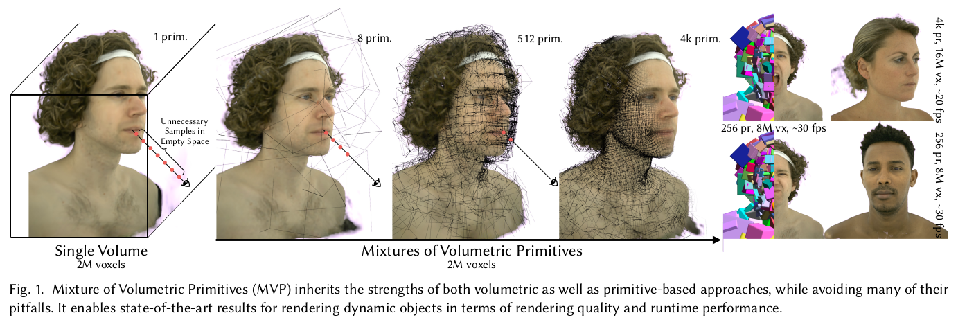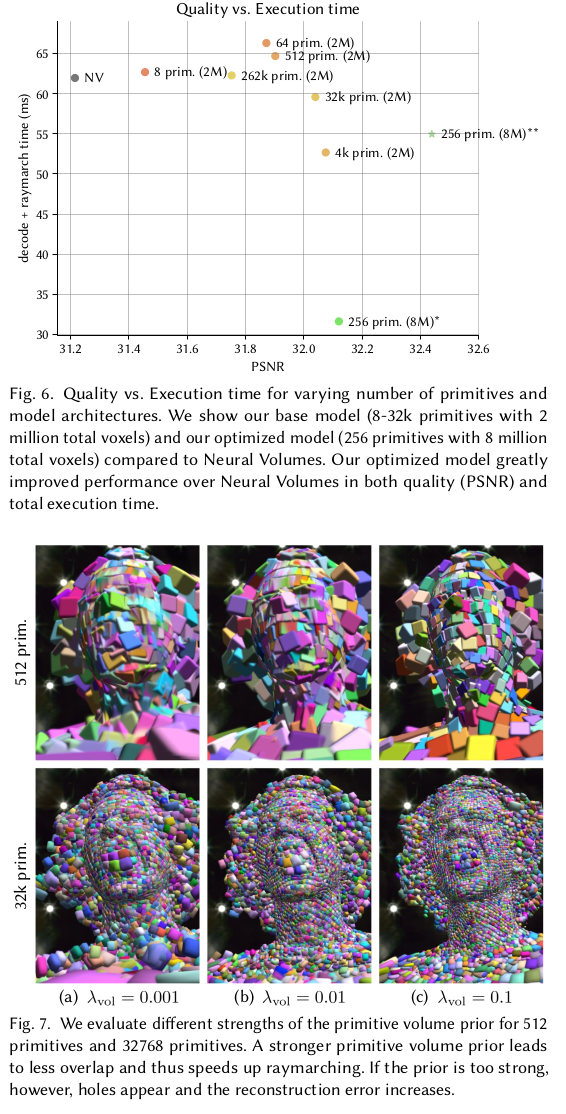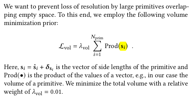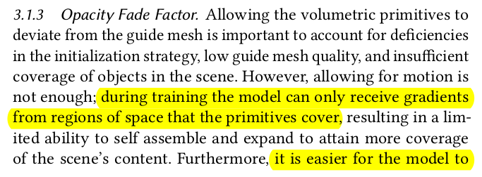 그리고 각 mesh face 마다 volume primitives (위치, 크기, 방향 포함)을 할당한다. 그리고 각 volume primitives는 세부적으로 voxel로 쪼개져있도록 했다. 초기화만 face를 사용하고 수렴 과정에서 vp가 맘대로 돌아다니도록 하면 의미가 없으니 face에 조금 얽매여있을 수 있도록 위치와 방향은 face 대비 상대값으로 설정해두었다. |
