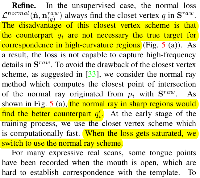 ![]() 근데 하나 topology가 다를 경우 사용하는 cloest distance 기준은 문제 되는 상황이 있다. 바로 surface 굴곡이 심할 경우, cloest point가 원래 대응되어야 할 위치에 매칭되는 상황이 줄어듦. 따라서 이 경우 cloest point를 쓰는게 아니라 normal ray 와 가장 가까운 point를 할당했다. -> 이건 왠지 plucker coordinate 써서 했지 않을까? 계산이 쉬우니까. -------------- cloest point로 일단 학습을 시작하고 나서 어느정도 loss가 saturation에 접어들면 그 때 normal ray를 활용한 matching 기준으로 전환한다고 한다. + laplacian 추가 |