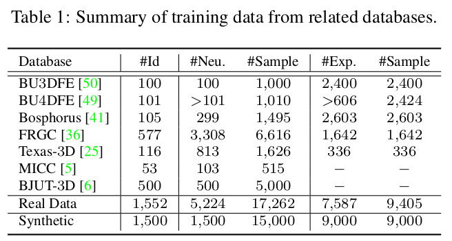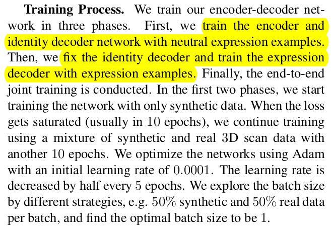 1) id 만 먼저 학습 (무표정 데이터 써서) 2) expression은 id holding한 상태로 다시 (표정 데이터 써서) 3) synthetic 데이터로만 먼저 학습 4) 수렴되고 나면 나중에 real 3d scan 데이터 추가. |