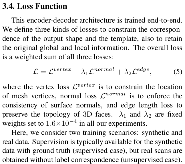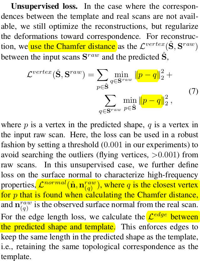 topology가 다른 real scan data일 경우 vertex loss를 cloest point로 계산하는 chamfer distance를 사용하고 normal 역시 cloest point 간의 normal edge는 비교대상이 없으므로 template 모델이 갖고 있는 edge 길이와 비교한다. (이게 기본 template을 사용했을 것 같진 않고 registration해서 썼지 않을까) |