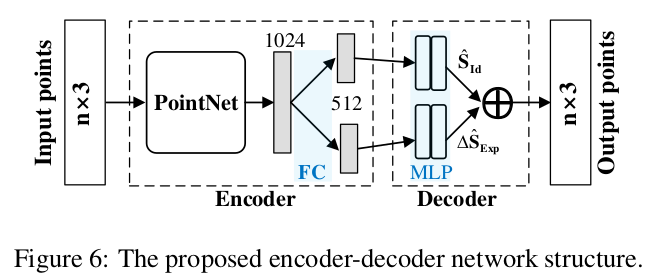입력은 3D SCAN에서 무작위로 N개 point를 뽑아 flatten한 것. encoder를 통과하면, shape latent, expression latent로 변환됨. shape, expression latent는 개별 decoder를 통해 Nx3의 위치값, displacement값을 예측함. shape + d expression 형태 이 때 decoder를 MLP를 안쓰고 기존 모델의 eigenvector를 써도 되겠지만 그러면 표현력이 모델에 한정되기 때문에 그냥 열린 상태로 MLP 쓴 것 같음. |