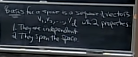 - 주어진 space에 대해 이를 구성하는 최소 vector 들을 basis라고 부른다. 이들은 각각 independent해야 하며 확장했을 때 주어진 space를 만들어낼 수 있어야 한다.