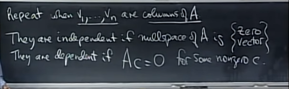 - 아예 표현을 앞서 배운 개념을 활용하여 재정립하면, matrix A의 nullspace가 zero vector 뿐일 경우 independent이고 nullspace가 따로 존재할 경우 depedent하다고 볼 수 있다.