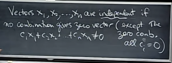 - column의 independence는 각 column의 linear combination으로 zero vector를 못만드는지 확인하면 된다. 전부 다 0을 곱해서 억지로 만드는 zero combination을 제외하고는 만들 수 없을 경우, 모든 column은 independent하다고 볼 수 있다.