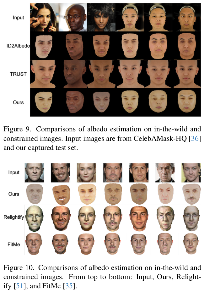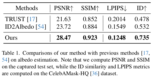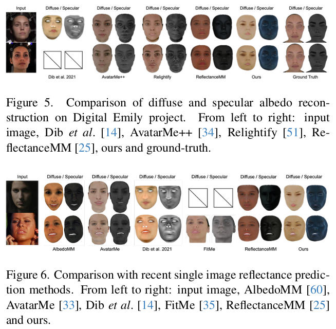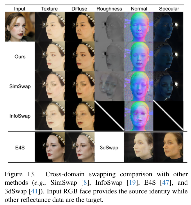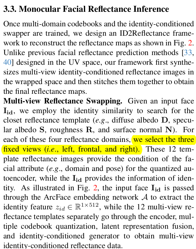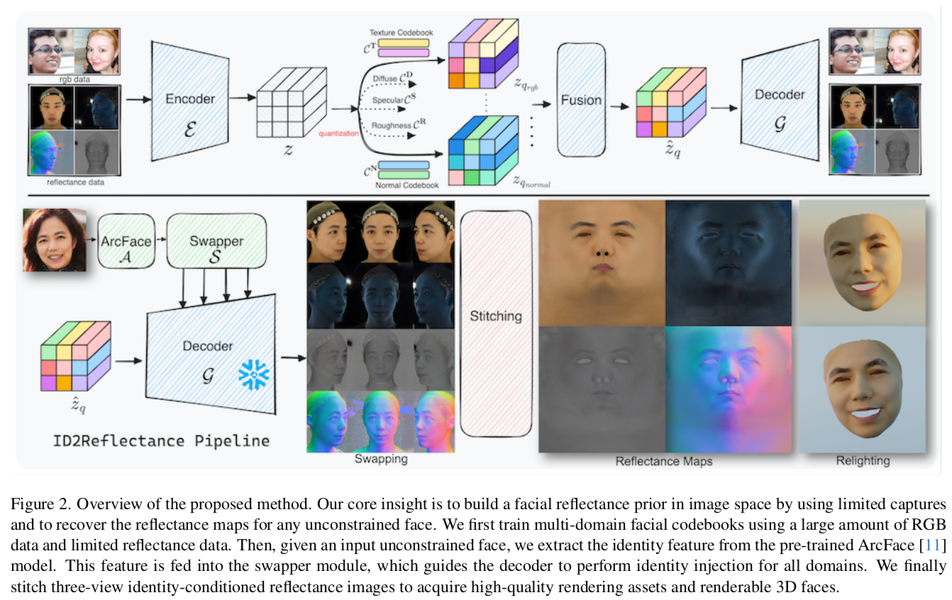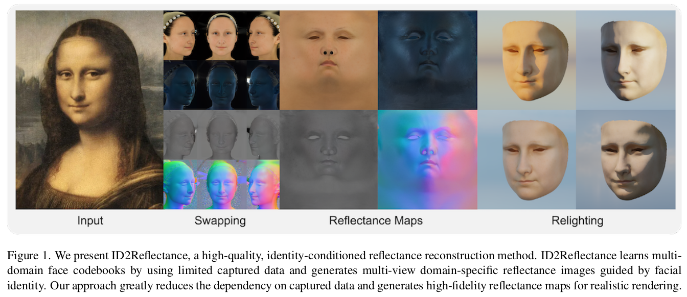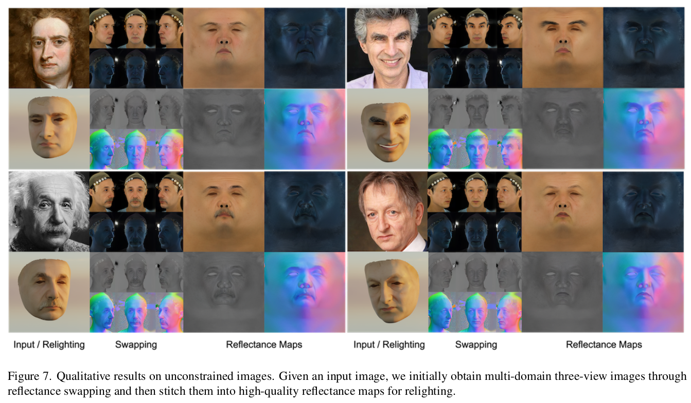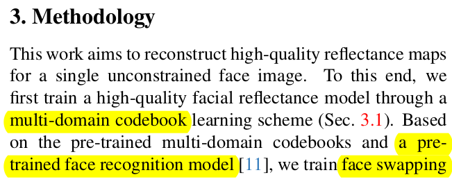 이 논문은 image to reflectance를 풀고자 한 논문이다. UV domain의 결과값을 내뱉는 기타 논문들과 달리 입력 이미지의 pixel마다 어떤 reflectance property를 갖고 있는지 추정한다. 위 그림의 swapping까지가 논문의 결과물이고 이후 mesh로 만드는 과정은 Deep3D와 같은 image to mesh lifting 알고리즘을 붙여야 한다.
