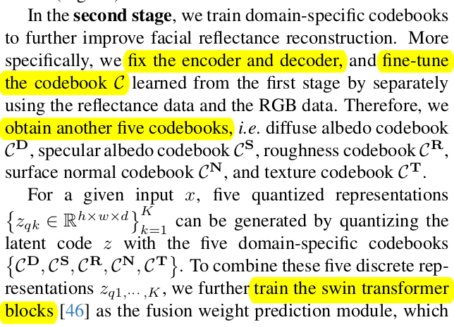 그 다음 encoder-decoder freeze 한 뒤, 1) code book만 한 번 더 업데이트 2) fusion model 추가해서 5개의 codebook을 aggregation! -> 이 때 swin transformer 구조를 썼다고 함. |