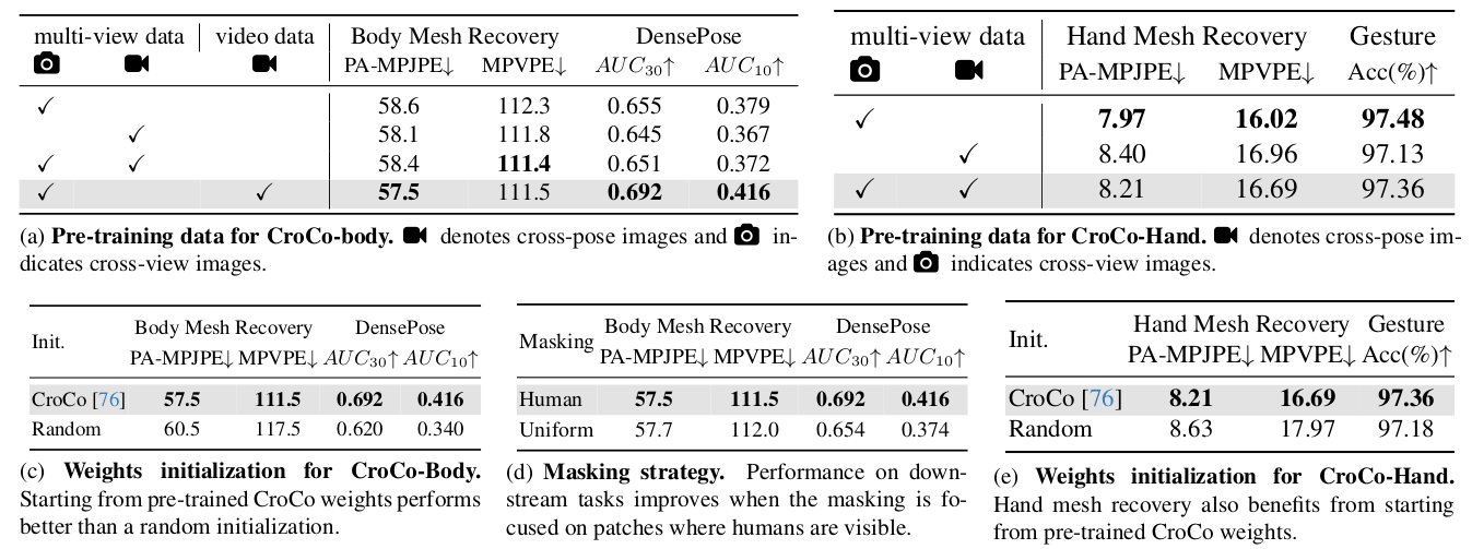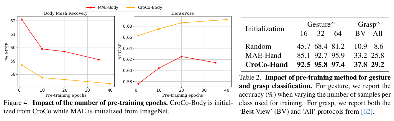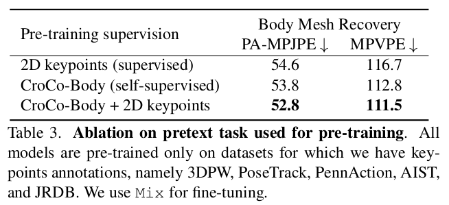 확실하게 random보다는 도움이 크게 되고 또 하나는 완전 self supervised보다 2d keypoint로 하는 것도 좋다는 것 ->이건 sapiens에서 pose estimation으로 튜닝된 feature가 semantic 정보가 더 뛰어나게 나오는 결과로 미루어보아. feature localziation이 잘되어서 그런 것 같다. |