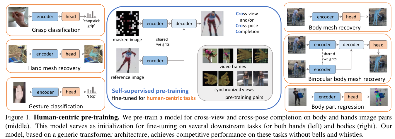 CVPR 2024에 나온 Croco human data 버전이다. 드래프트가 arxiv에 공개되었을 때 읽어봤었는데 CVPR2024에 나왔다. Croco라는 논문이 geometry를 타겟으로 하긴 했지만 워낙 좋은 컨셉이다 보니 도메인을 사람으로 한정한 내용이다. 사실 알고리즘적으로 더 뛰어난 내용이 있다기 보다 사람 데이터로 하면 어떤지 실험해본 테크니컬 리포트에 가깝다.
