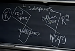 - m x n matrix A가 있을 때, n차원 공간에 있는 subspace는 N(A)와 C(A.T) 이며 m차원 공간에 있는 subspace는 C(A)와 N(A.T)이다.